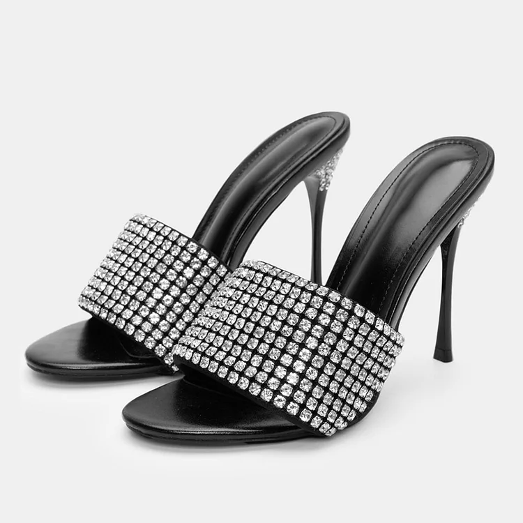 Elevate your style with these Black Rhinestone Embellished High Heel Mules. Featuring an open round toe design and sparkling rhinestones, these mules add glamour and sophistication to any outfit.