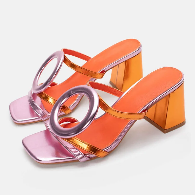 Step into style with our Pink and Orange Metallic Block Heel Ring Decor Mules! These eye-catching sandals boast a vibrant color palette, trendy ring detailing, and a comfortable block heel.